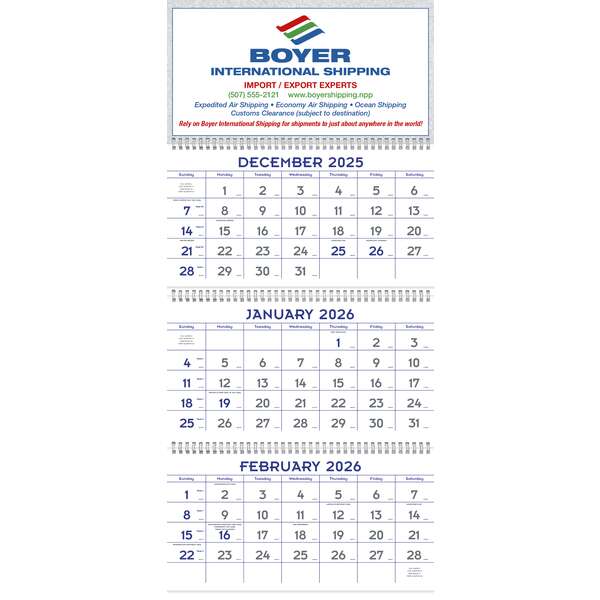 DescriptionThis 14-month calendar runs from December through January. The 4-panel/3 pad style is twin-looped and has a large imprint area. Grid blue & gray matches 286 blue and 431 gray. All 3-grids include Julian dates. Top markets: retail, manufacturing, construction. Standard imprint color is black.