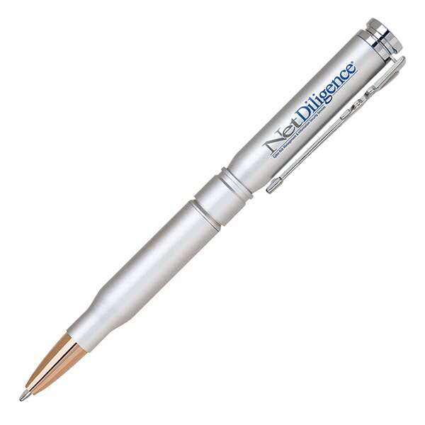 DescriptionBrass bolt action ballpoint pen. Bullet shaped barrel with a rifle style clip and bullet style tip