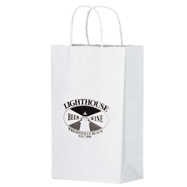 Description Less is more, especially with this Twisted Paper Handle Shopper! This classic styled shopping bag is made with White Kraft paper with matching twisted handles. This 10” x 13” bag has a serrated cut top along with 5” bottom and side gussets. Add your customization with up to 2 spot colors on 1 or 2 sides. Please note to print 2 color artwork requires that there be at least 1/2" of space between the imprint colors.